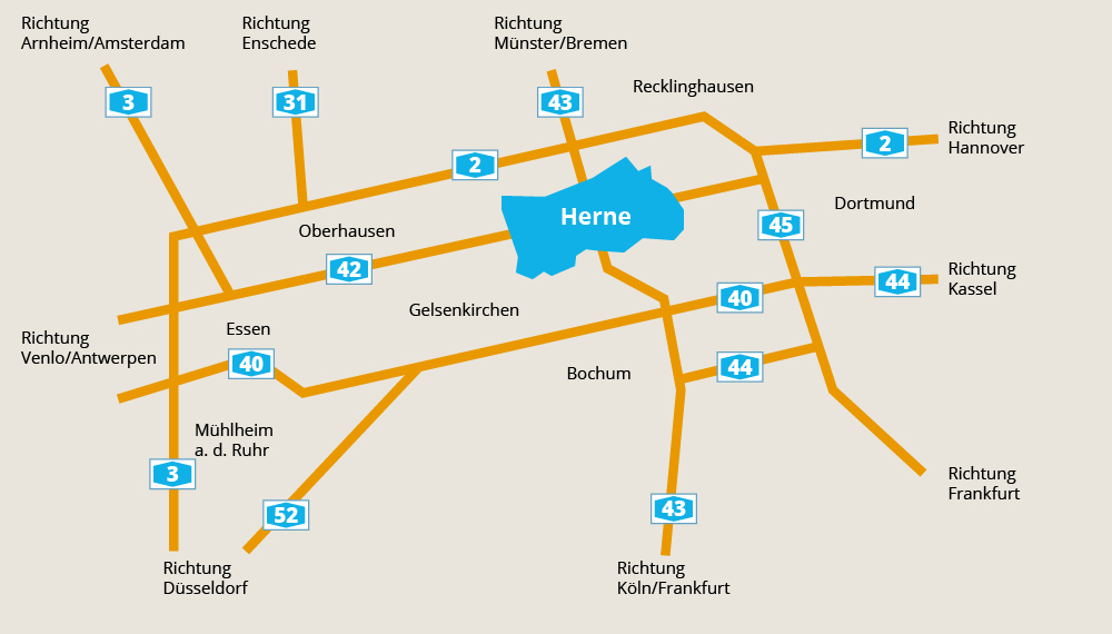 Die Verkehrsinfrastruktur ist ausgezeichnet mit schnellen Autobahnverbindungen in alle Richtungen (A43 in Nord – Süd Richtung Ausfahrt Herne-Eickel hinter dem Zurbrüggen Möbelhaus gelegen).